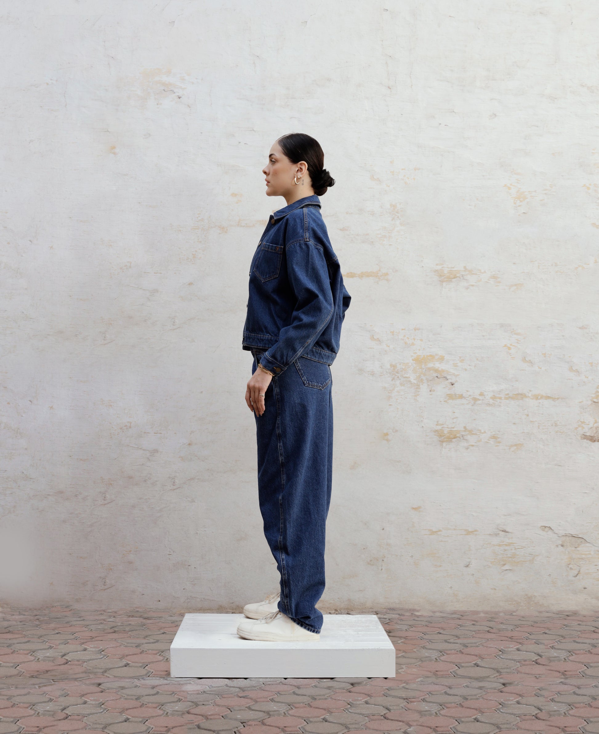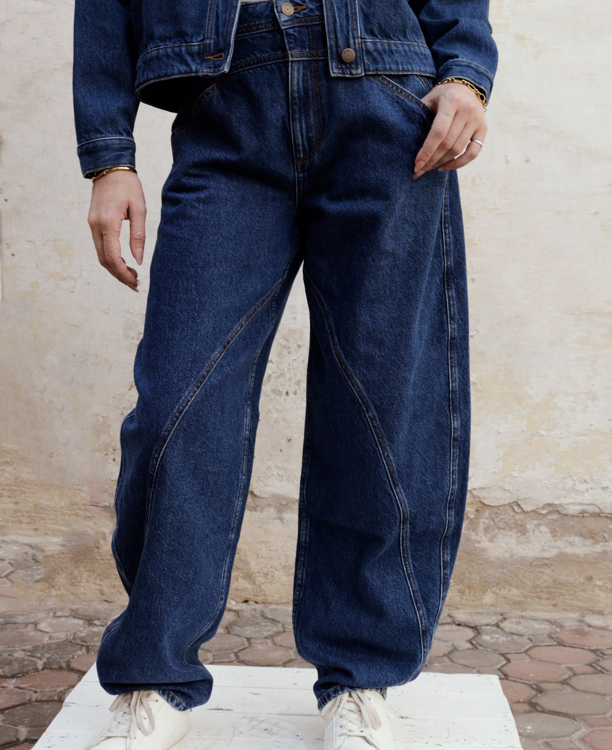 A sculptural silhouette with character. Le Barrel offers a modern a moden balon fit that gently tapers at the ankle. Its architectural shape is balanced bt the softeness of pure cotton denim, making it both bold and wearable. Style with a tucked in short for a refined look, or paired with La Veste Courte for an effortless everyday chic.